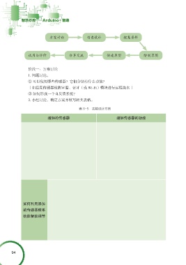 智慧芯控——Arduino+ 智造 方案讨论 创意设计 搜集资料 试用与评价 分享交流 快速原型 绘制草图 阶段一:方案讨论 1. 问题讨论。 ① 可以使用哪些传感器?它们分别有什么功能? [如温度传感器检测室温、蓝牙(或 Wi-Fi)模块进行远程浇水] ② 如何形成一个自反馈系统? 2. 小组讨论,确定方案并填写相关表格。 表 8-5 功能设计方案 增加的传感器 增加传感器的功能 如何利用添加 的传感器使系 统能智能调节 94