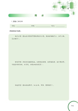 附 录 附 录 1. 活动 C 学习单 学校: 班级: 姓名: 活动任务计划表: 设计方案(建议采用思维导图梳理设计方案,包括准备做什么、为什么做、 怎么做等): 绘制草图(用纸和笔描绘想法,如绘制流程图、制作路线图、设计界面等, 可能会用到白纸、记号笔、彩色水性软笔等): 快速原型(建议就地取材,如 A4 纸、布条、塑料瓶等): 113