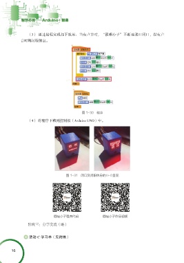 智慧芯控——Arduino+ 智造 (3) 通过编程实现如下效果:当有声音时,“假唱小子”不断地张口闭口,没有声 音时则闭眼休息。 图 1-30 程序 (4) 将程序下载到控制板(Arduino UNO)中。 图 1-31 闭口及闭眼休息的LED呈现 假唱小子程序代码 假唱小子作品视频 阶段三:分享交流(略) 活动 C 学习单(见附录) 16