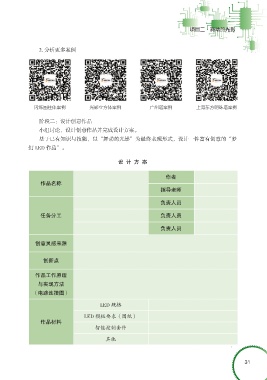 2. 分析更多案例 闪烁圆柱体案例 光影立方体案例 广州塔案例 上海东方明珠塔案例 阶段二:设计创意作品 小组讨论,设计创意作品并完成设计方案。 基于已有知识与技能,以“舞动的光影”为最终表现形式,设计一件富有创意的“梦 幻 LED 作品”。 设 计 方 案 作者 作品名称 指导老师 负责人员 任务分工 负责人员 负责人员 创意灵感来源 创新点 作品工作原理 与实现方法 (电路连接图) LED 规格 LED 模板要求(图纸) 作品材料 智能控制套件 其他 31