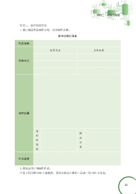 阶段三:制作创意作品 1. 制订创意作品制作计划,设计制作步骤。 制作过程记录表 作品名称 组员姓名 具体任务 任务分工 制作步骤 遇 解 到 决 的 方 困 案 难 补充说明 2. 按设定的计划制作作品。 注意不同品种 LED 不能混用,否则会造成并联的一层或一竖 LED 不发光。 33