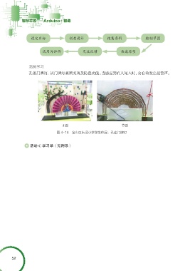 智慧芯控——Arduino+ 智造 设定目标 创意设计 搜集资料 绘制草图 试用与评价 交流反馈 快速原型 案例学习 孔雀门牌灯:该门牌灯兼顾美观及防盗功能。当感应到有人闯入时,会自动发出报警声。 正面 背面 图 4-16 金山区朱泾小学学生作品:孔雀门牌灯 活动 C 学习单(见附录) 52