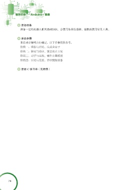 智慧芯控——Arduino+ 智造 活动准备 具备一定的机器人相关基础知识,会使用各类传感器,能熟练使用常见工具。 活动步骤 本活动步骤可自行确定,以下步骤仅供参考。 阶段一:想象与讨论,生成金点子 阶段二:研究与论证,制定设计方案 阶段三:动手与实践,制作方案模型 阶段四:讨论与交流,评价跟随设备 活动 C 学习单(见附录) 74
