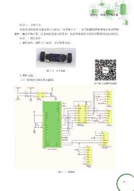 阶段一:分析任务 本次活动的任务是通过学习与探究“自平衡小车”,运用陀螺仪模块和电机驱动模块 制作一辆自平衡小车。思考如何完成本次任务?认识并准备好本活动中需用到的主要模块。 阶段二:模仿制作 1. 制作底盘。制作小车底盘,并安装单片机。 图 7-6 小车底盘 2. 制作电路。 (1) 绘制自平衡小车电路图。 自平衡小车硬件电路图 图 7-7 电路图 77