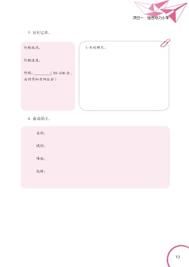 项目一 组合动力小车 3. 运行记录。 行驶状况: 小车的照片: 行驶速度: 外观: (50~100 分, 由同学和老师打分) 4. 活动设计。 名称: 规则: 场地: 成绩: 13