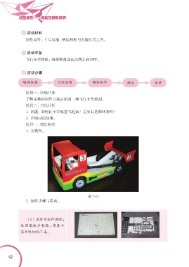 炫酷模型——海陆空模新视界 活动材料 制作套件、5 号电池、粘接材料与其他常用工具。 活动准备 飞行卡车样机;视频资料及相关图片和 PPT。 活动步骤 明确任务 讨论分析 模仿制作 测试 分享 阶段一:明确任务 了解完整的制作方法后仿制一辆飞行卡车模型。 阶段二:讨论分析 1. 问题:如何让卡车模型飞起来?需要具备哪些条件? 2. 归纳讨论结果。 阶段三:模仿制作 1. 实物图。 图 7-2 2. 制作步骤与要点。 (1) 设计并打印图纸; 处理图纸并粘贴;将各个 零部件切割下来。 62