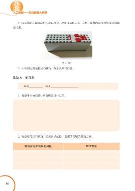 人工智能——为机器植入智慧 2. 电动测试:将电动机连接电池盒,控制电动机正转、反转,观察内窗框在轨道内的移 动情况。 图 8-10 3. 小组间交流窗框运行情况,分享成果与经验。 活动 A 学习单 班级 姓名 1. 观察平开窗结构,绘制模型设计草图。 2. 观察作品运行状况,记录调试过程中发现的问题及解决方法。 电动运行时出现的问题 解决方法 86