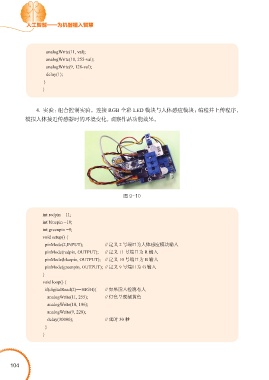 4. 实验:组合控制实验。连接 RGB 全彩 LED 模块与人体感应模块;编程并上传程序,