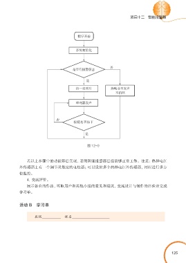 项目十二 智能报警器 图 12-9 若以上步骤中的功能都已实现,表明智能报警器已经能够正常工作。注意:热释电红 外传感器上有一个调节灵敏度的电位器;可以设置多个热释电红外传感器,用以进行多方 位监控。 4. 交流评价。 展示各自的作品,听取用户和其他小组的意见和建议,交流设计与制作的经验并完成 学习单。 活动 B 学习单 班级 姓名 125