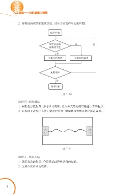 人工智能——为机器植入智慧 2. 将循迹的规律抽象成算法,设计并绘制程序的流程图。 图 1-10 阶段四:编程调试 1. 根据程序流程图,参考学习资源,运用分支结构编写循迹小车的程序。 2. 在场地上运行小车并记录运行结果,尝试修改参数以优化循迹效果。 图 1-11 阶段五:交流小结 1. 展示各自的作品,介绍调试过程中获得的经验。 2. 交流本次活动的收获。 6