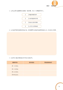 项目一 智能汽车 1. 思考运用传感器解决问题的一般步骤,为以下步骤编写序号。 【 】 测量参数的规律 【 】 分析将检测的对象 【 】 挑选合适的传感器 【 】 运用分支结构编程 2. 思考超声波传感器的安装位置,绘制简图以描述传感器安装的方式、位置和方向等。 3. 记录本小组认领的探究任务及实践结果。 探究任务 是否成功 需改进的地方 第一次尝试 第二次尝试 第三次尝试 第四次尝试 11
