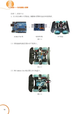 人工智能——为机器植入智慧 阶段二:搭建小车 1. 以小组为单位开展活动,根据参考资料完成小车的搭建。 + + Arduino Uno 板 电机驱动板 小车底盘 图 2-3 (1) 将电机驱动板安装在小车底盘上。 图 2-4 (2) 将 Arduino Uno 板安装在小车底盘上。 图 2-5 18