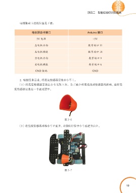 项目二 智能红绿灯识别系统 电机驱动卡接线位置见下表: 电机驱动卡接口 Arduino 接口 5V 电源 +5V 左电机方向 数字端口 11 左电机调速 数字端口 10 右电机方向 数字端口 9 右电机调速 数字端口 6 GND 接地 GND 2. 根据任务需求,将亮度传感器安装在小车上。 (1) 将亮度传感器安装在小车支架上方。为了减少环境光线对传感器的影响,应将亮 度传感器安装在一个遮光罩中。 图 2-6 (2) 将亮度传感器对准小车正前方,并使红灯位于小车前进方向上。 图 2-7 19