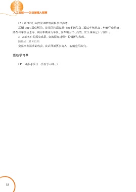 人工智能——为机器植入智慧 (2) 路口通行调度管理控制模块程序参考。 运用 WIFI 通信模块,接收即将通过路口的车辆信息,通过车辆状态、车辆行驶轨迹、 路况与车流信息等,调度车辆通行等级,使车辆有序、高效、安全地通过十字路口。 2. 展示各自的探究成果,交流探究过程中的创新与发现。 阶段四:项目总结 交流本次活动的收获,尝试开展更多的人工智能应用探究。 活动学习单 (略,可参考项目一活动学习单。) 32