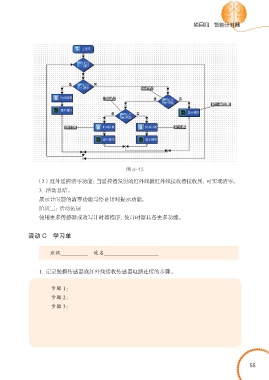 项目四 智能计时器 图 4-13 (2) 红外遥控清零功能:当遥控器发射的红外线被红外线接收器接收到,可实现清零。 3. 活动总结。 展示计时器的清零功能与停止计时提示功能。 阶段二:活动拓展 使用更多传感器或改写计时器程序,使计时器具备更多功能。 活动 C 学习单 班级 姓名 1. 记录触摸传感器或红外线接收传感器电路连接的步骤。 步骤 1: 步骤 2: 步骤 3: 55