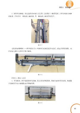 项目八 智能窗户 3. 制作外部框架:在底部搭建两根凸点孔梁(之间隔开 3 根梁宽度),作为两扇内窗框 的轨道,并在其中一根轨道上铺齿条,另一根轨道上铺光滑的瓦片。 图 8-7 在框架底部两侧 3~4 厘米高处用 L 型梁和长孔梁搭建导向围栏,防止内窗框滑落。最 后加装支架以支撑整个窗户框架。 图 8-8 阶段三:调试与总结 1. 手动测试:用手轻轻旋转马达轴,使之带动齿轮旋转,观察内窗框移动情况,观察整 个结构是否有卡顿现象或者其他问题。 图 8-9 85