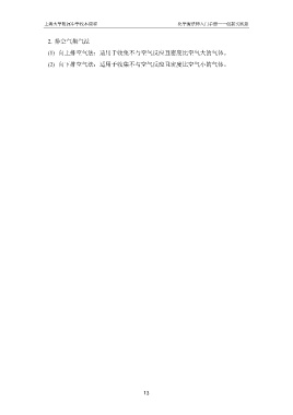 上海大学附属中学校本课程 化学魔法师入门手册——创新实践篇 2. 排空气集气法 (1) 向上排空气法:适用于收集不与空气反应且密度比空气大的气体。 (2) 向下排空气法:适用于收集不与空气反应且密度比空气小的气体。 13