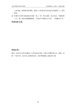 上海大学附属中学校本课程 化学魔法师入门手册——创新实践篇 入混合液。随着液体的渗吸,滤纸中心的黄色样点痕迹向外逐渐扩大,成为 黄环。 (4) 待黄环半径扩展至滤纸半径的二分之一时,取下滤纸,拔下纸芯。等滤纸稍 干后,喷上饱和的碳酸钠溶液,于是在甲基橙外面出现了一个酚酞的红环。 实验现象记录: 实验反思: 请网上查阅可以进行色素纸上层析的花朵品种,采摘不同颜色的花朵,研磨,选 取一个展开剂,进行纸上层析的实验。实验步骤根据上述实验自拟。 37