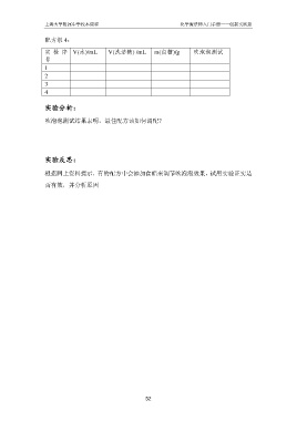 上海大学附属中学校本课程 化学魔法师入门手册——创新实践篇 配方组 4: 实 验 序 V(水)/mL V(洗洁精) /mL m(白糖)/g 吹泡泡测试 号 1 2 3 4 实验分析: 吹泡泡测试结果表明,最佳配方该如何调配? 实验反思: 根据网上资料提示,有的配方中会添加食醋来调节吹泡泡效果,试用实验证实是 否有效,并分析原因 52