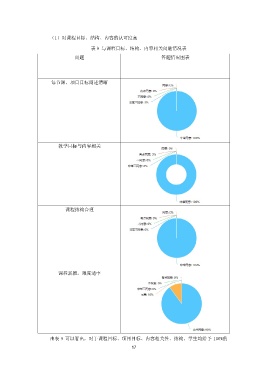 (1)对课程目标、结构、内容的认可度高 表 9 与课程目标、结构、内容相关问题情况表 问题 答题情况图表 每节课,项目目标阐述清晰 教学目标与内容相关 课程结构合理 课程新颖,难度适中 由表 9 可以看出,对于课程目标、项目目标、内容相关性、结构,学生均给予 100%的 17