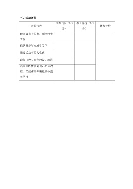 五、活动评价: 学生自评(1-5 组长评价(1-5 评价内容 教师评价 分) 分) 能完成有关信息、图文收集 工作 能认真参与完成学习单 通过活动有很大收获 能提出岩石研究的设计想法 活动中既能做到自己充分演 练,又能帮助并谦让其他组 员学习