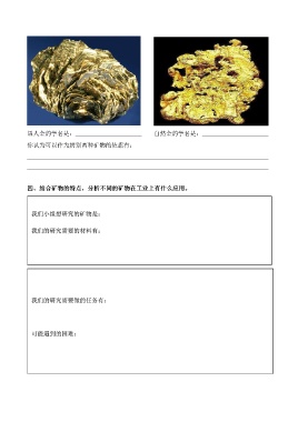 愚人金的学名是: 自然金的学名是: 你认为可以作为辨别两种矿物的依据有: 四、结合矿物的特点,分析不同的矿物在工业上有什么应用。