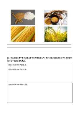 四、你还知道土壤中哪些因素会影响农作物的生长吗?如何在校园的免耕农场中开展你的研 究?写下你们小组的想法。