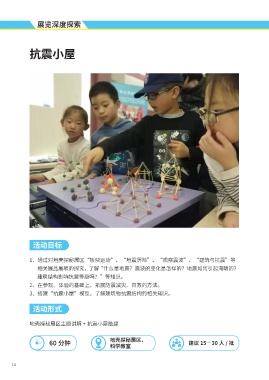 展览深度探索 抗震小屋 活动目标 1、通过对地壳探秘展区“板块运动”、“地震历险”、“观察震波”、“建筑与抗震”等 相关展品展项的探究,了解“什么是地震?震波的变化是怎样的?地震如何引起海啸的? 建筑结构影响抗震等级吗?”等知识。 2、在参观、体验的基础上,拓展防震减灾、自救的方法。 3、搭建“抗震小屋”模型,了解建筑物抗震结构的相关知识。 活动形式 地壳探秘展区主题讲解 + 抗震小屋搭建 地壳探秘展区、 60 分钟 建议 15—30 人 / 批 科学教室 14 ൭Ҩ JOEE ༯