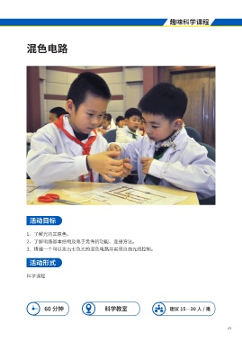 趣味科学课程 混色电路 活动目标 1、了解光的三原色。 2、了解电路基本结构及电子元件的功能、连接方法。 3、搭建一个可以发出七色光的混色电路并实现自由光线控制。 活动形式 科学课程 60 分钟 科学教室 建议 15—30 人 / 批 23 ൭Ҩ JOEE ༯