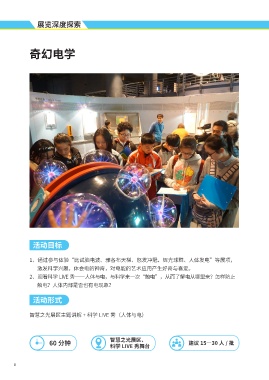 展览深度探索 奇幻电学 活动目标 1、通过参与体验“比试脑电波、雅各布天梯、怒发冲冠、辉光球群、人体发电”等展项, 激发科学兴趣,体会电的神奇,对电能的艺术应用产生好奇与喜爱。 2、观看科学 LIVE 秀——人体与电,与科学来一次“触电”,从而了解电从哪里来?怎样防止 触电?人体内部是否也有电现象? 活动形式 智慧之光展区主题讲解 + 科学 LIVE 秀(人体与电) 智慧之光展区、 60 分钟 建议 15—30 人 / 批 科学 LIVE 秀舞台 8 ൭Ҩ JOEE ༯
